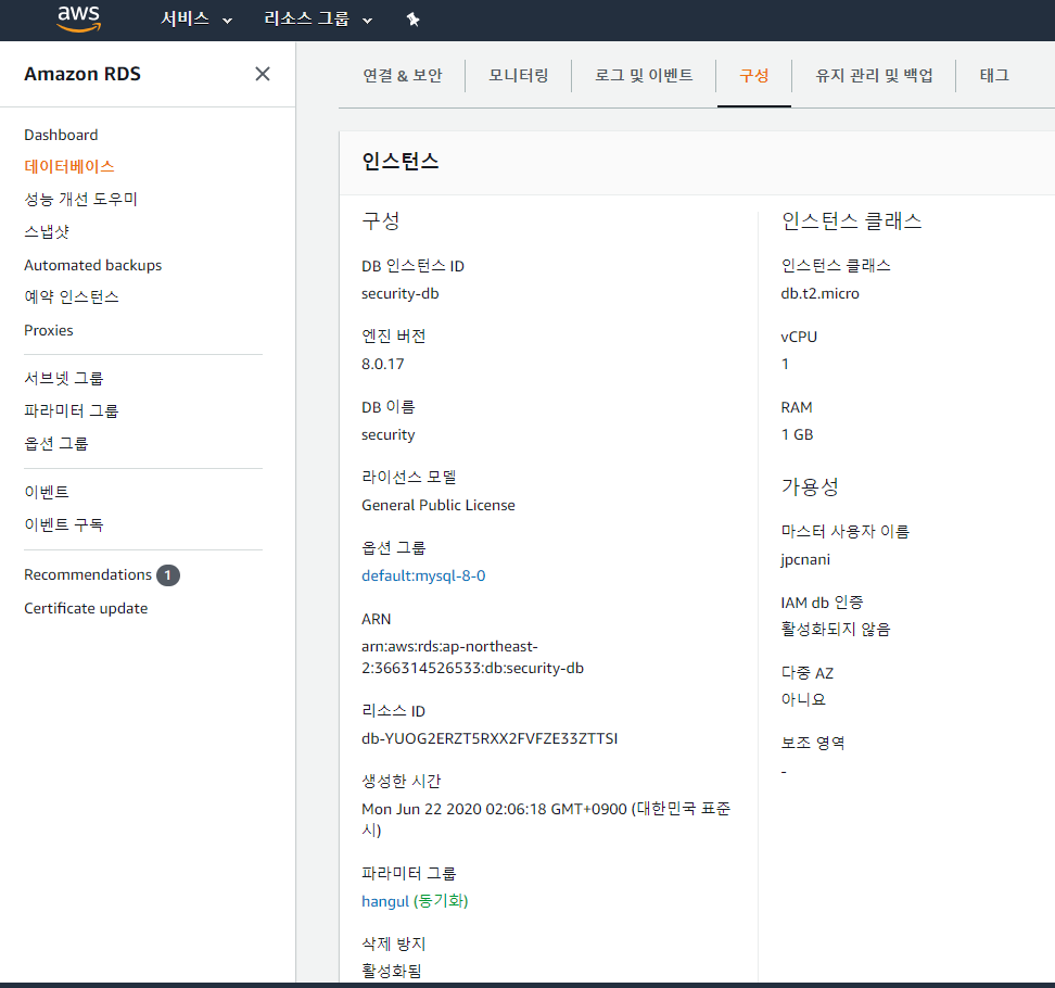 db 인스턴스를 선택한 후 구성을 클릭 후 하단으로 스크롤을 내리면