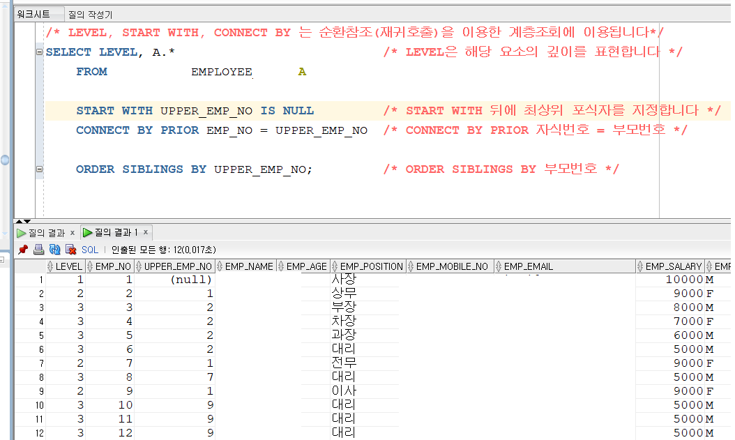 ORDER SIBLINGS BY UPPER_EMP_NO /* ORDER SIBLINGS BY 부모번호 */