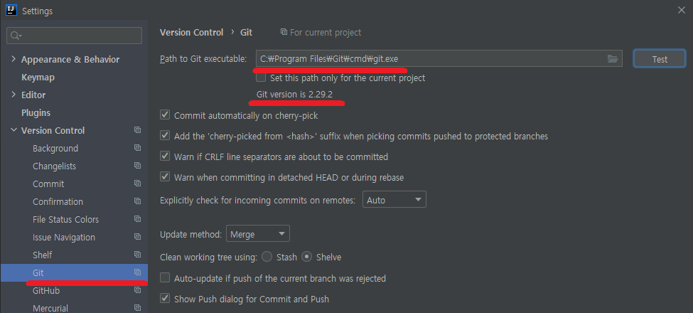 Version Control 하위에 있는 Git으로 들어가서 Git이 설치된 경로의 git.exe를 잡아주고