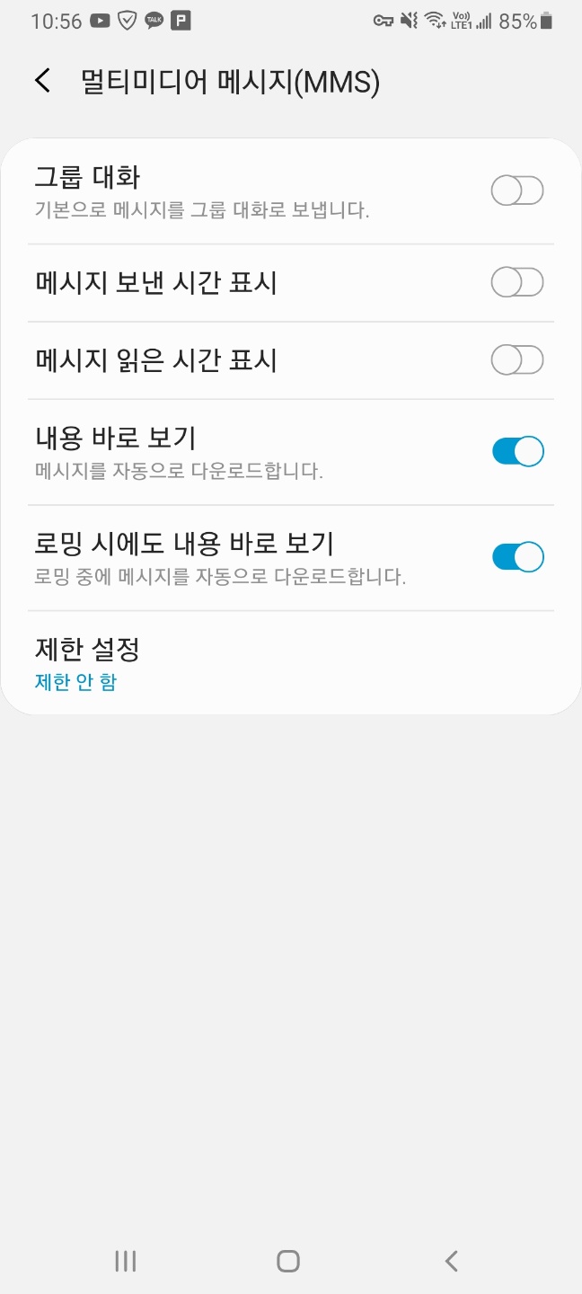 1번 문제는 메시지 앱 - 메뉴 - 설정 - 추가 설정 - 멀티미디어 메시지(MMS)에 진입한 이후