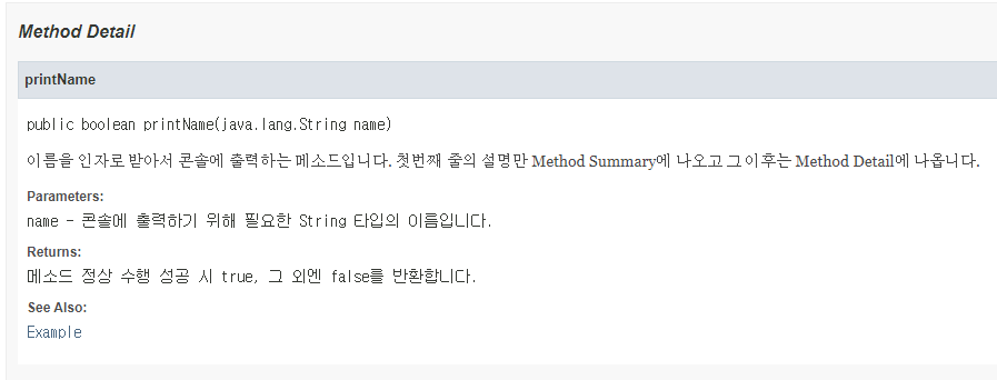 | @see | 함께 참조할 다른 메소드나 클래스 등 |