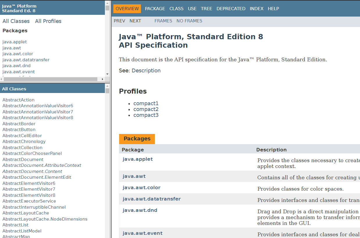 JavaDoc 예시. ( 오라클 Java Se 1.8 )