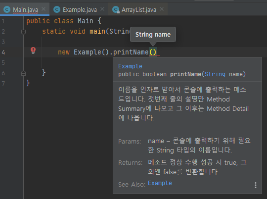 해당 클래스나 메소드를 사용하려 할 때에, 이에 대한 설명이 자동으로 따라와 보여지므로
