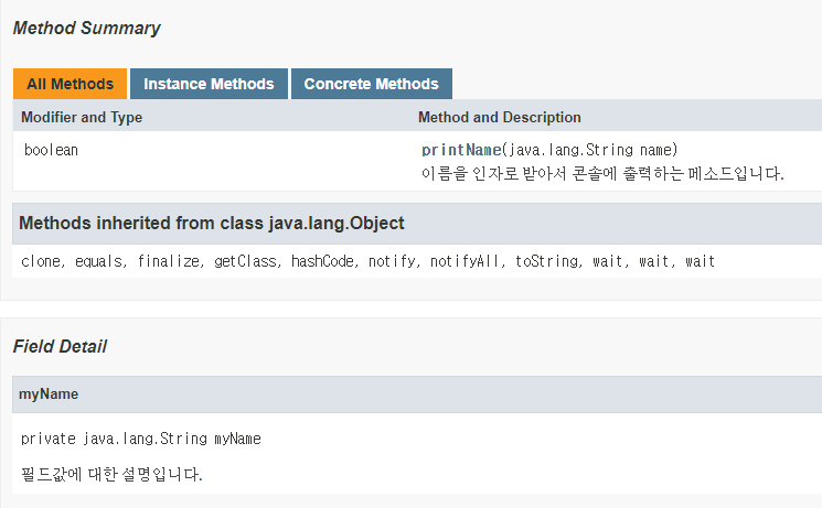 * 첫번째 줄의 설명만 Method Summary에 나오고 그 이후는 Method Detail에 나옵니다.